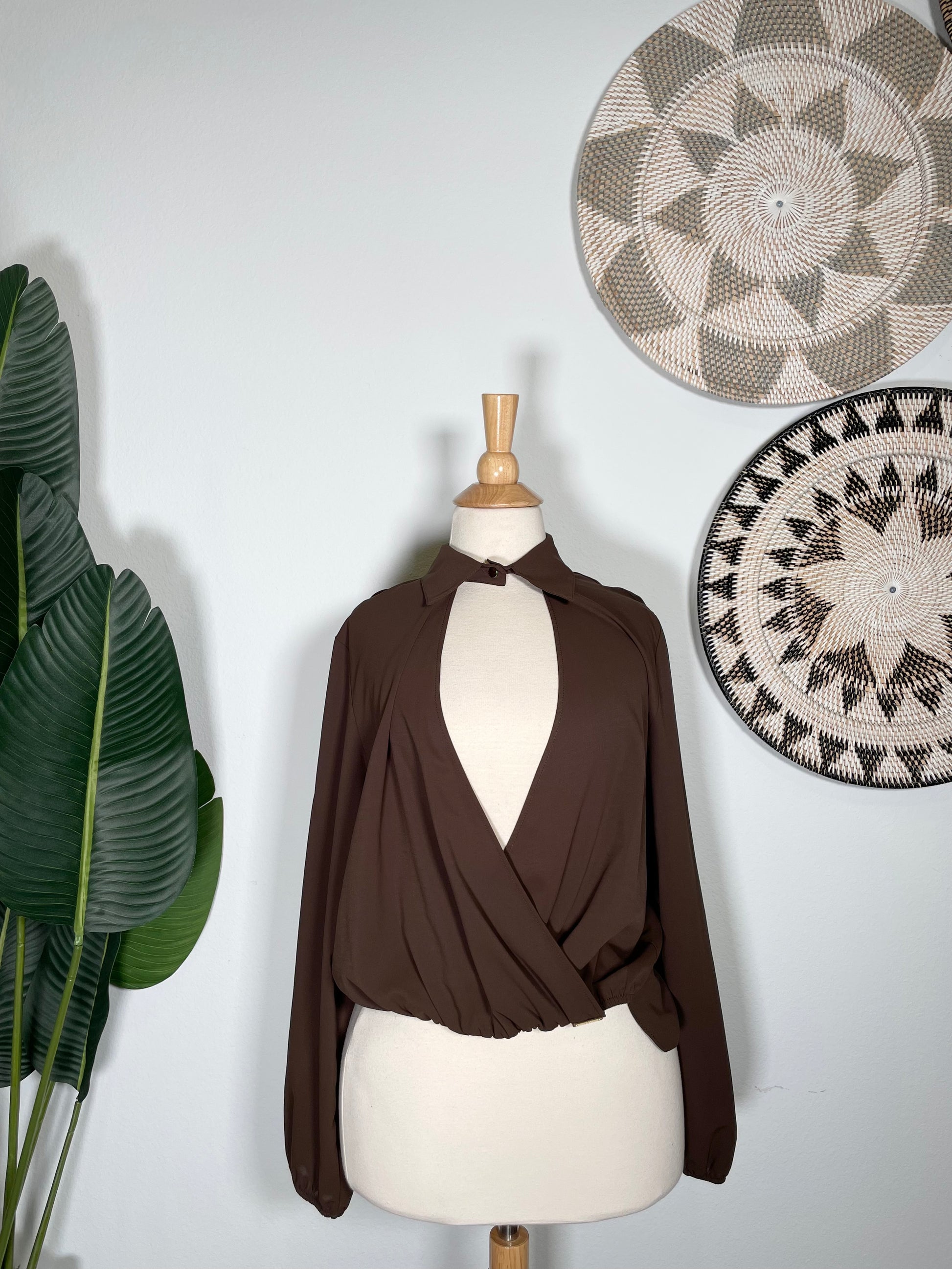 Chiffon open chest design, collar neck design and gold detail. Runs normal. No stretch.