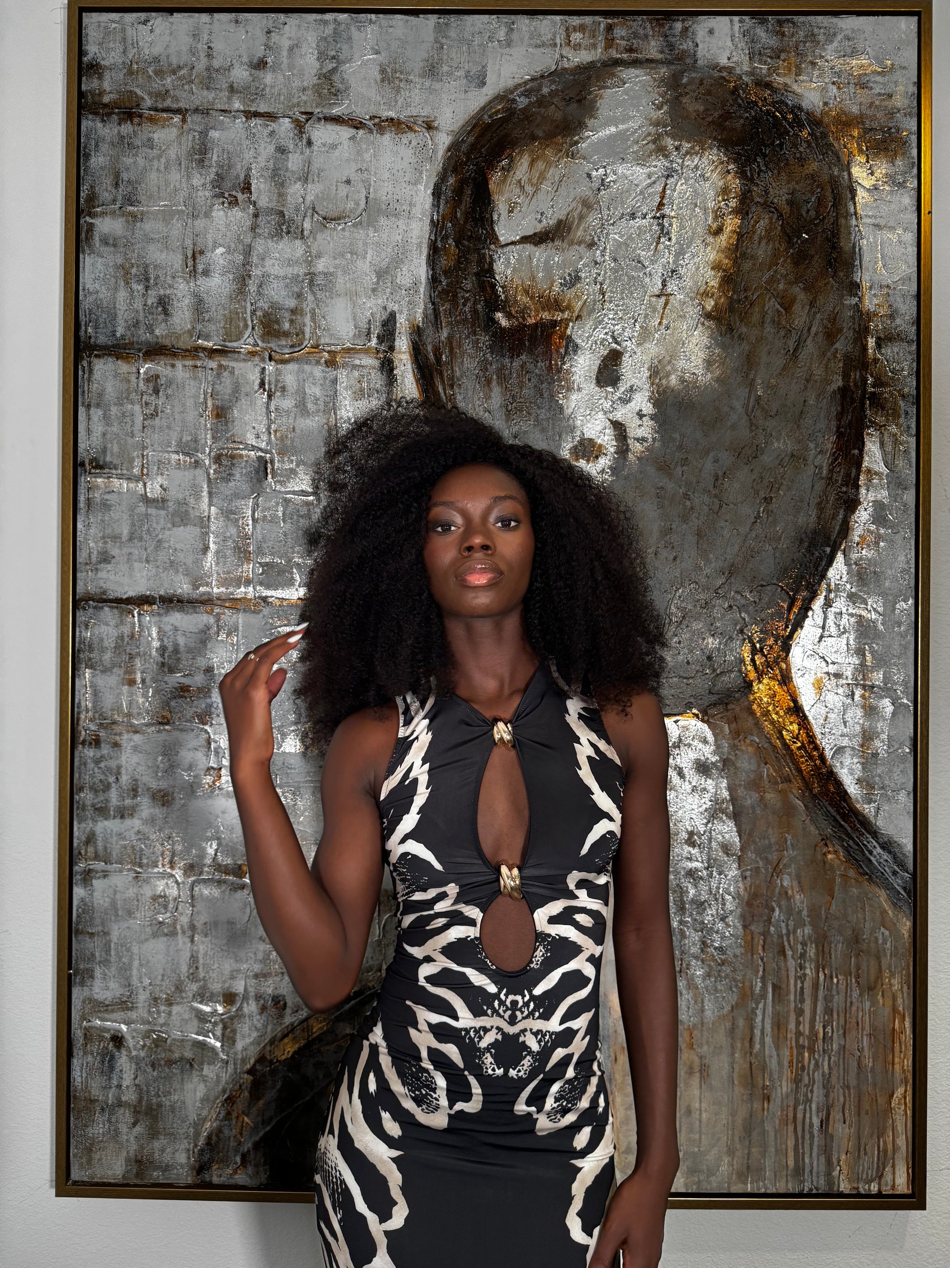 Own the night in the bold print dress. This body con dress will be sure to turn heads, the gold detail is an added to accessory to the already captivating print. A striking cut-out leads from a high neck. Its body con silhouette and a maxi length, ready for impact. Style this knowing piece with minimal heeled sandals and refined gold accessories to complete your moment.